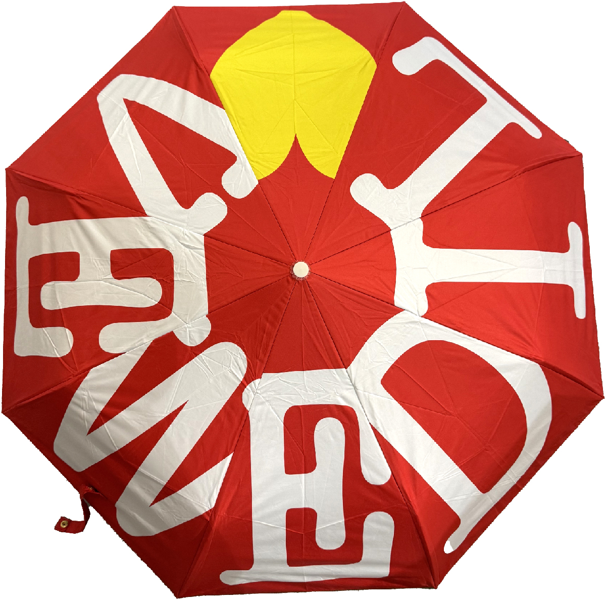 藤村忠寿還暦記念として制作した日傘(晴雨対応)。赤ベースに白文字で還暦お祝いイメージ。
