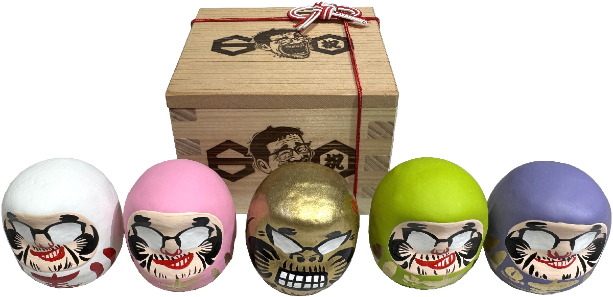 藤村忠寿の還暦を祝って高崎に有る茂田ダルマさんに特別に制作していただいたダルマを、還暦記念焼印を捺した檜の枡と赤杉の蓋に収納。全5色のブラインド販売になります。