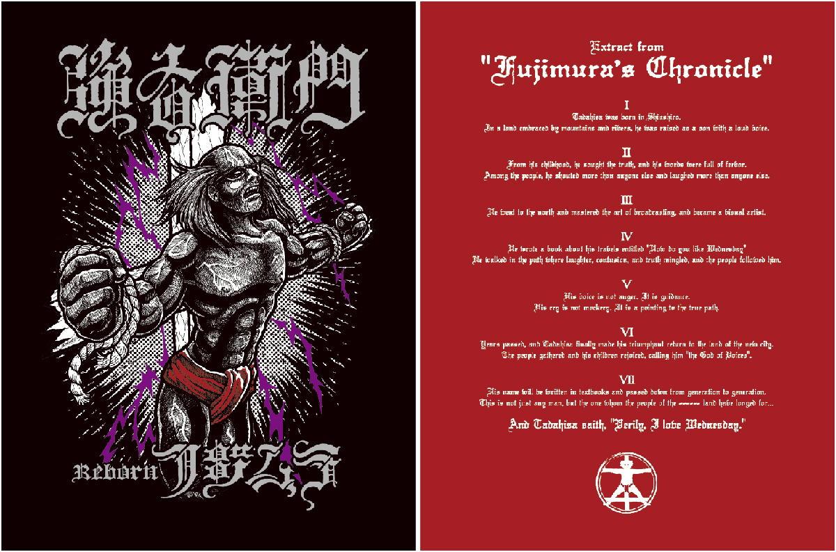 藤村忠寿生誕の地新城市では”藤村記”なるものが古来より伝わっており、伝承では藤村忠寿はかの鳥居強右衛門の生まれ変わりでは無いかという言い伝えが有るとか無いとか。。。フロントには大きく強右衛門のような藤村忠寿が、背中には藤村記の英訳がプリントされています。