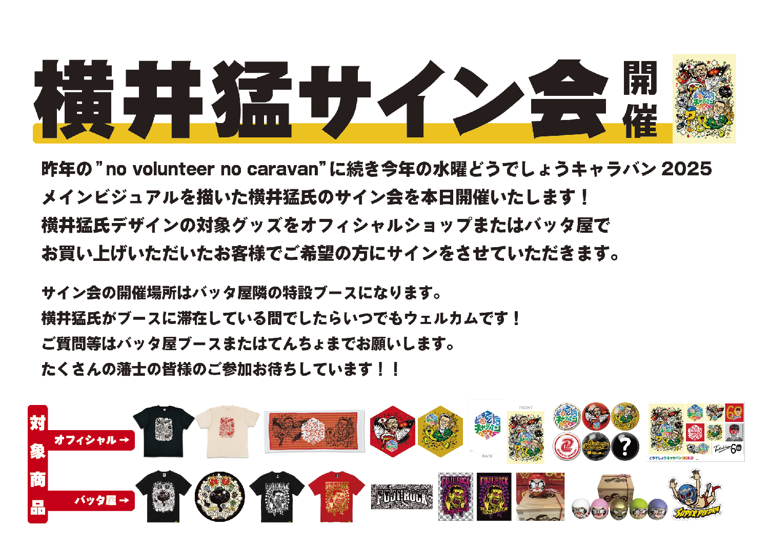 オフィシャルグッズショップ及びバッタ屋にて上記対象商品をご購入いただいた方でご希望の方に特設ブースにて横井猛氏がサインをさせていただきます。
